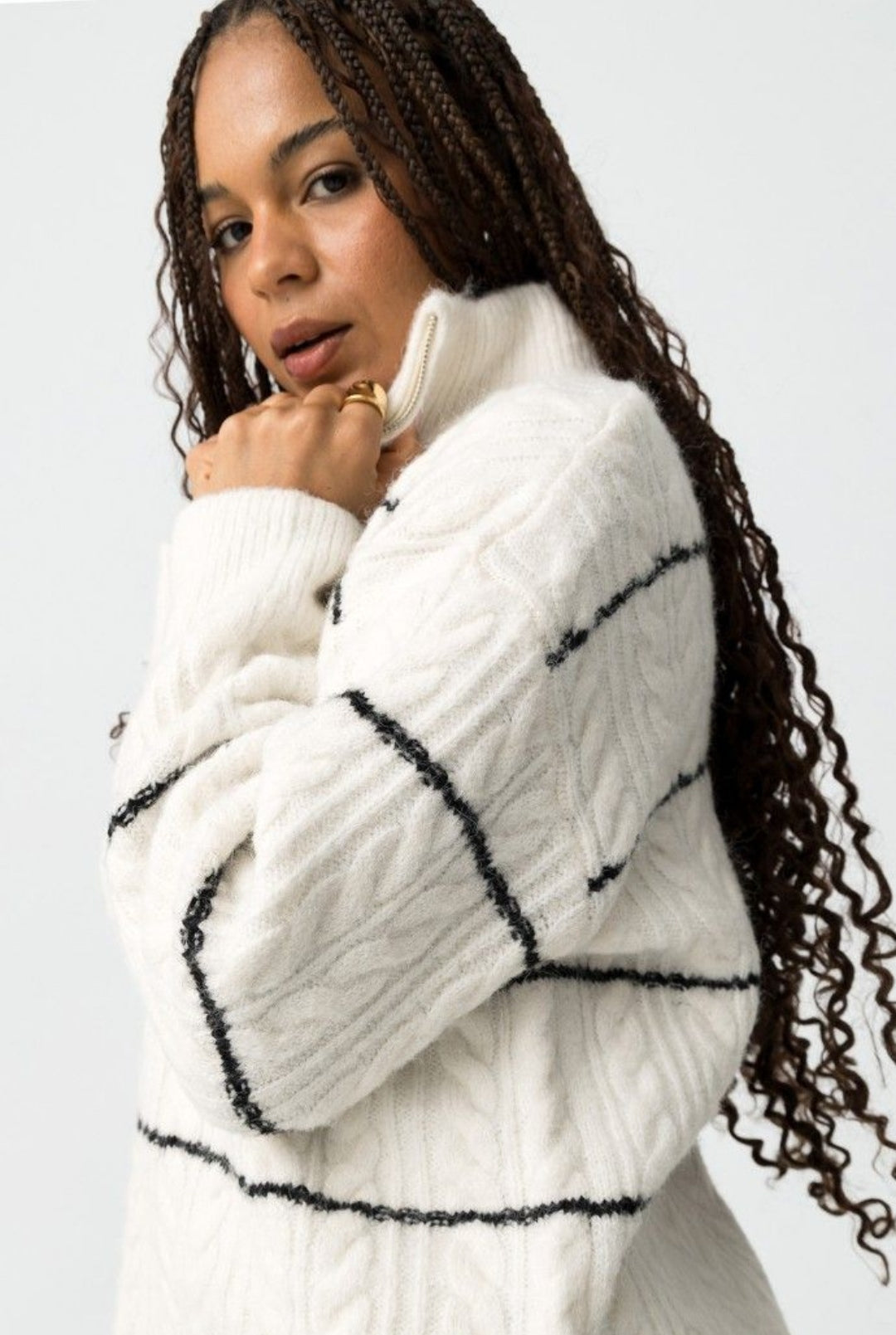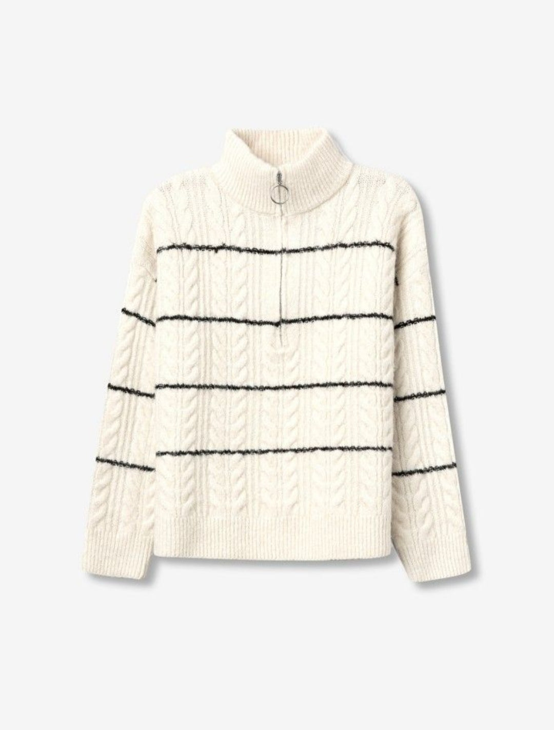 Confectionné dans une maille torsadée douce et structurée, il séduit par ses rayures noires contrastantes et son col montant zippé à anneau métallique, pour un look à la fois moderne et rétro.